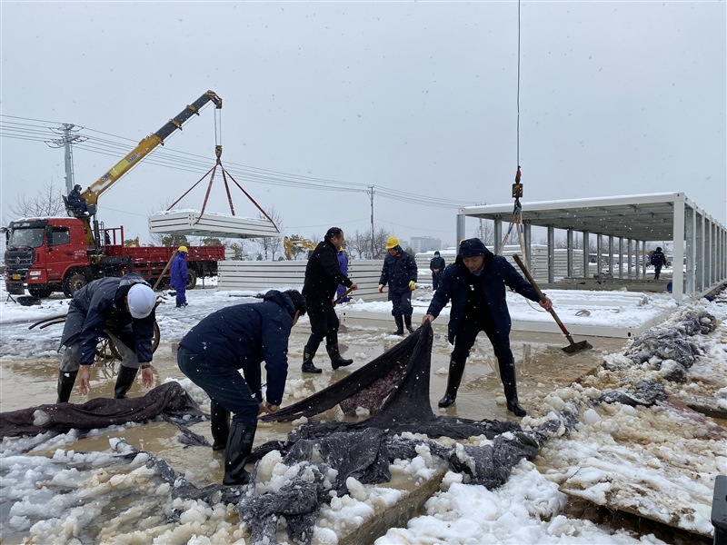 2月7日(農(nóng)歷正月初七),冬雪紛紛、寒風(fēng)瑟瑟,惡劣的天氣并未阻擋隔離點(diǎn)項(xiàng)目各參建單位的激情和干勁。中午12時(shí)40許,監(jiān)理單位在現(xiàn)場開展巡查,鰲峰建設(shè)在項(xiàng)目部組織施工會(huì)商工作。下午,國資集團(tuán)黨員突擊隊(duì)、志愿服務(wù)隊(duì)主動(dòng)請“戰(zhàn)”,步履匆匆赴現(xiàn)場鏟雪除冰。副區(qū)長王劍赴現(xiàn)場督查指導(dǎo)工作并對項(xiàng)目進(jìn)度表示肯定。