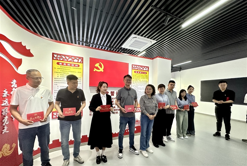 會前,集團黨建園地內(nèi),董事長楊靜帶領全體黨員重溫入黨誓詞,為上半年過政治生日的同志贈送政治生日賀卡。